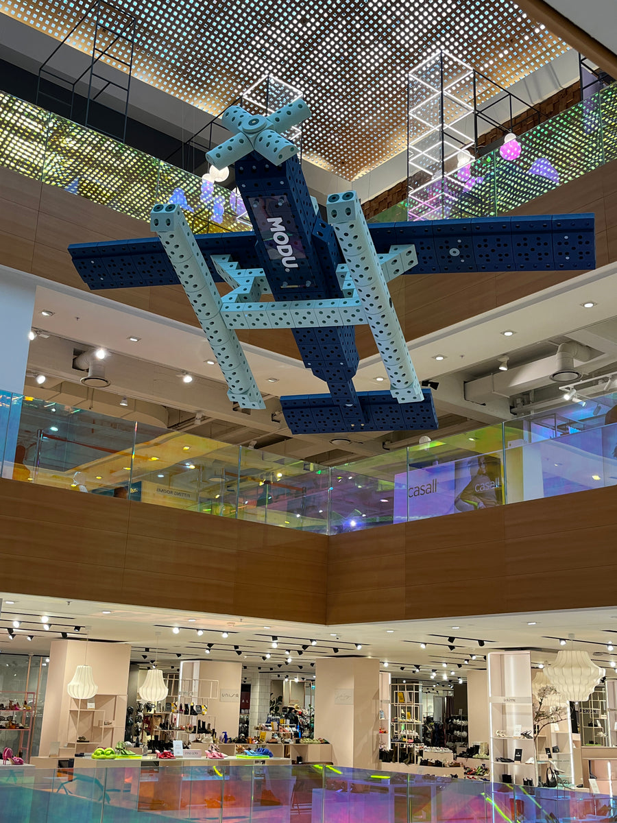 The buzz in our office has transformed into a reality far beyond our wildest dreams. Introducing the MODU Seaplane, a testament to innovation and playful design. With a staggering 4.5-meter wingspan, this installation is our largest and most ambitious project to date, perfectly timed with the opening of the new kids' department at ILLUM.