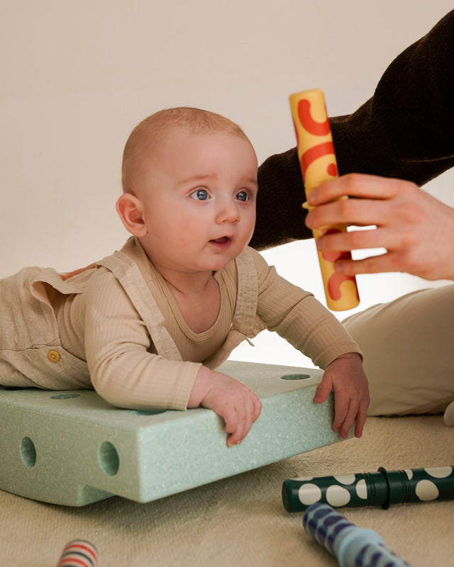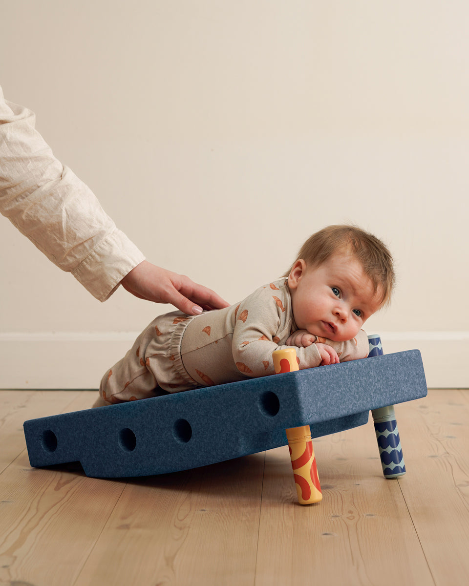 Once your baby has gained confidence lying on a flat surface and lifting their head, it's time to introduce more engaging challenges. Add some excitement and test their balance by placing them on a Scooter Board using the MODU Base Block and the MODU Swirly Wheels. Begin gradually, ensuring a slow increase in speed and changes of direction. Utilizing pegs as support and handles will help keep your baby secure throughout the activity.