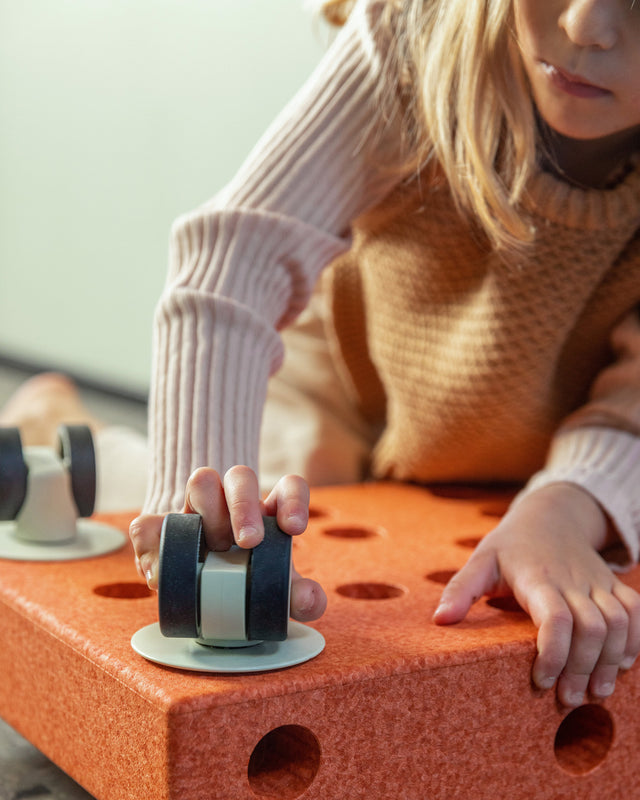 The MODU Tiny Ride is a perfect fit for young toddlers with a need for speed. With 360° movement and floor-protecting rubber, your little one can swirl around all day. If you need something that's a bit more beginner-friendly, use the MODU Foam Wheels. The large wheels provide good stability and help your child gain a sense of speed and balance. Cruising around indoors is great practice for when the time comes for them to learn how to use a balance bike or ride a real bike.