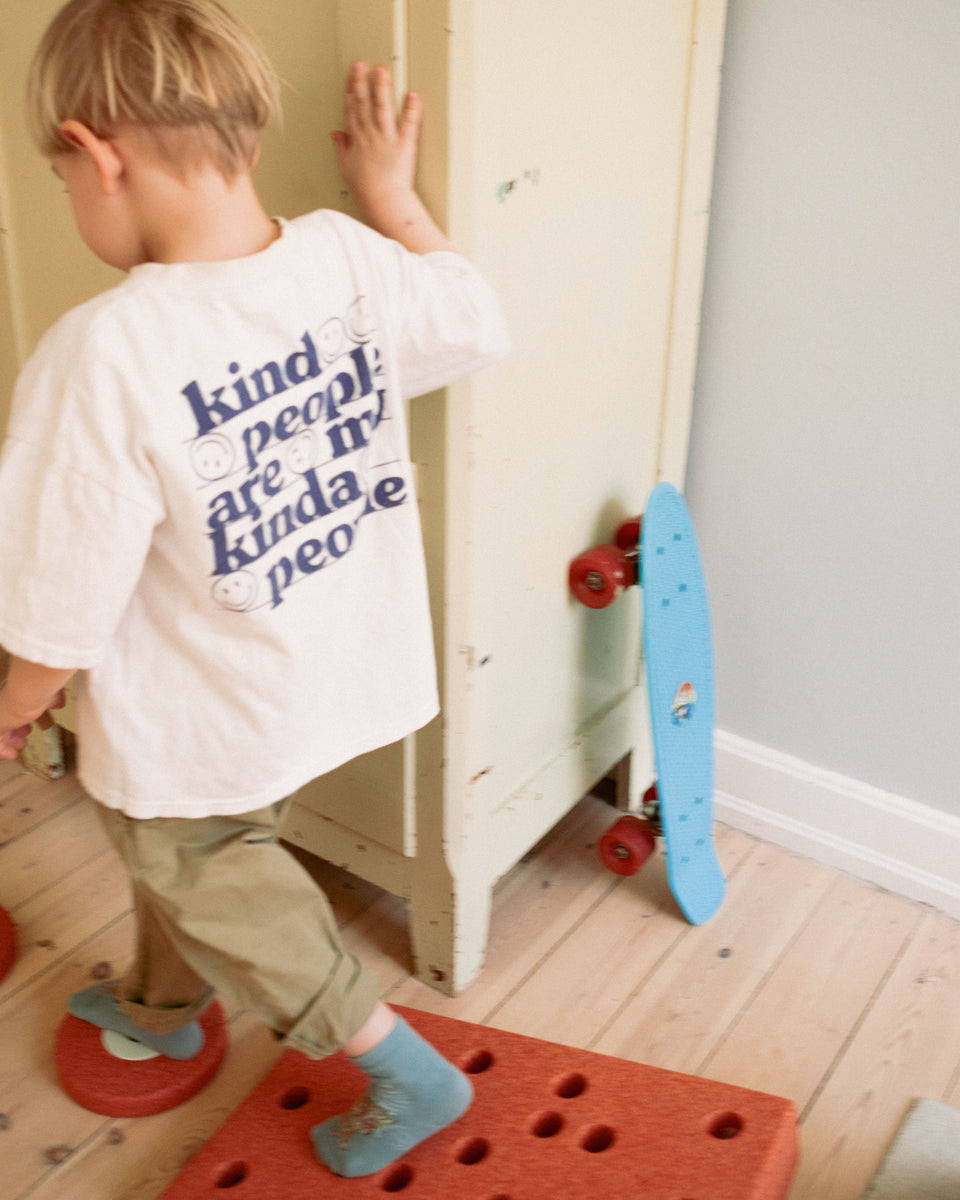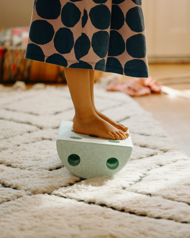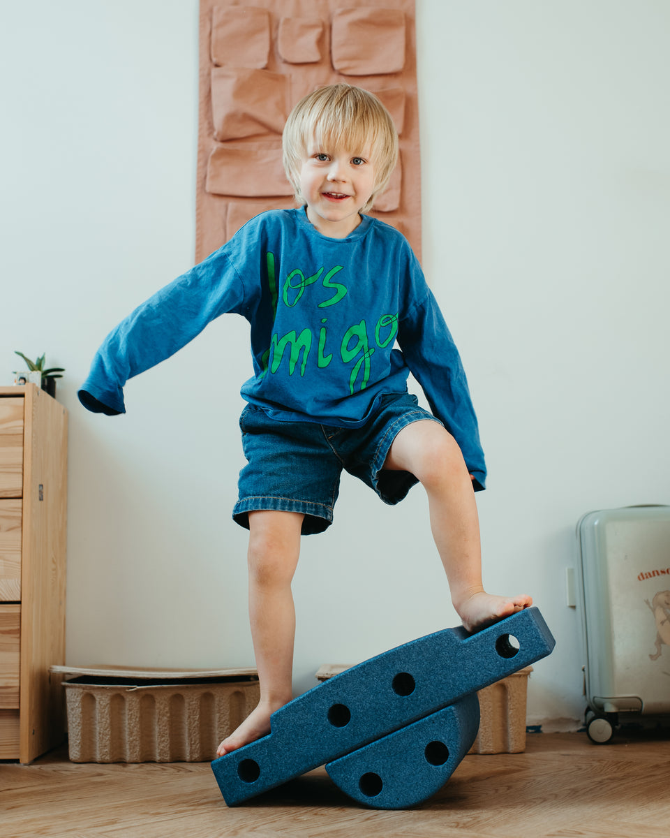 A balance board is a fun way to exercise both balance, core strength, and coordination. Young toddlers may start by laying on their belly or sitting on their knees, shifting the weight from side to side. Help the child to stand up and support if needed until they're comfortable with the movement.